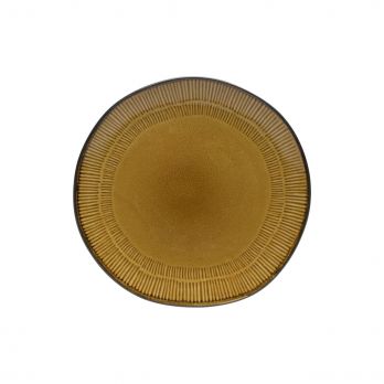 Ein flacher Teller mit einem Durchmesser von 22 cm, einem unregelmäßigen Rand und einem unkonventionellen Dekor in Ockerfarbe. Aus feiner Keramik.