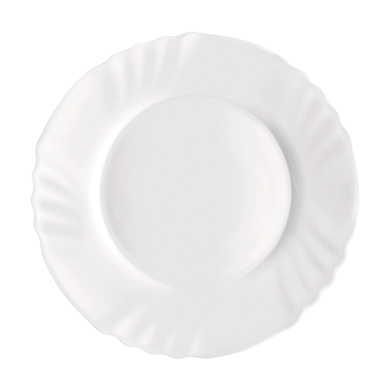 Flacher 25,5 cm Teller aus Opalglas, geeignet für Schulkantinen und Gastronomiebetriebe.
