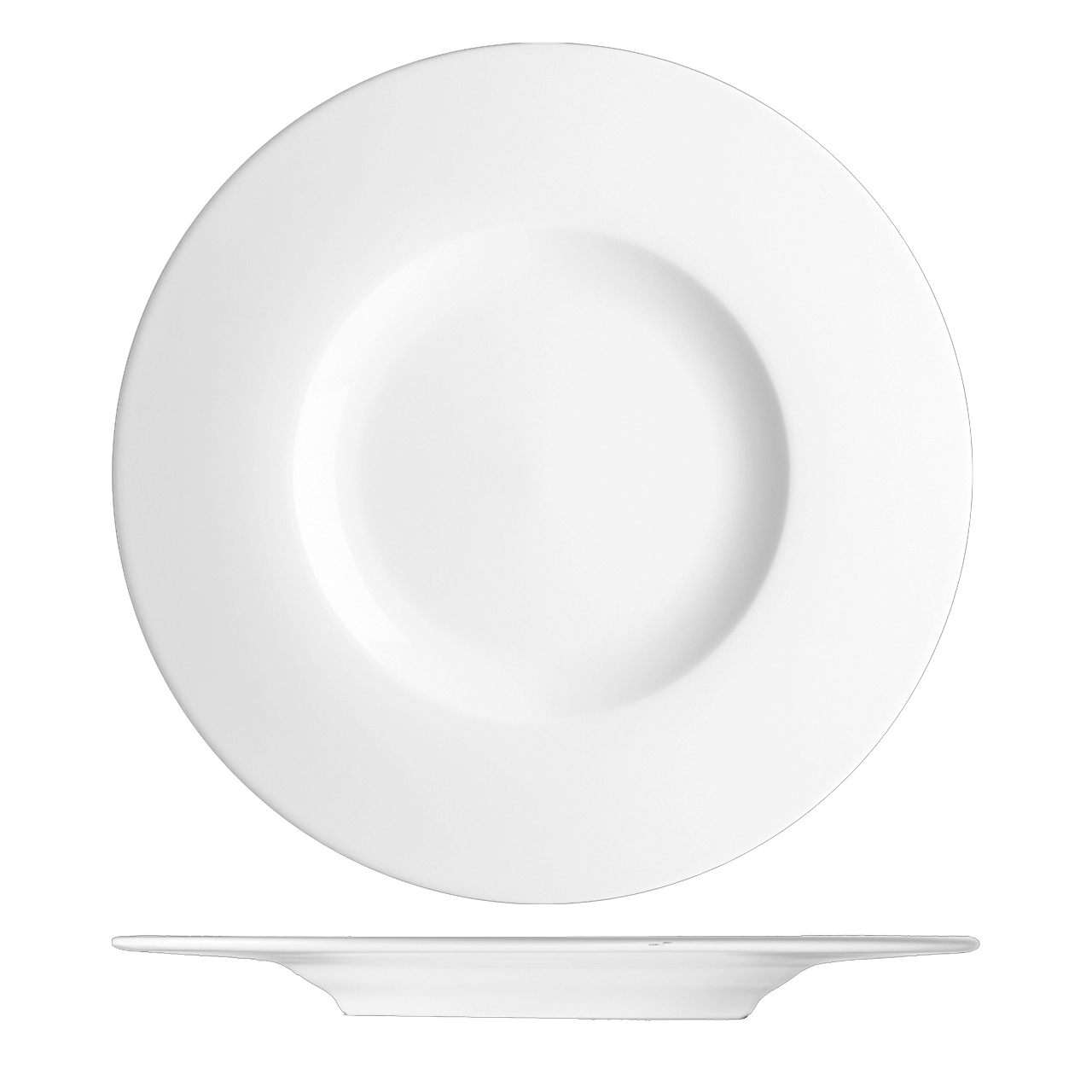 Flacher Teller mit 33 cm Durchmesser in modernem Design mit breitem Rand.
