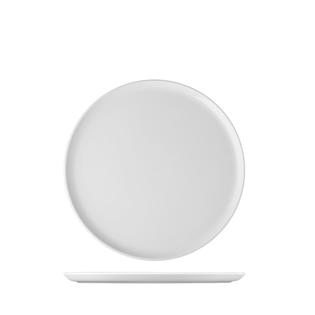 Flacher Teller mit 19 cm Durchmesser, ohne Rand und mit flachem Boden.