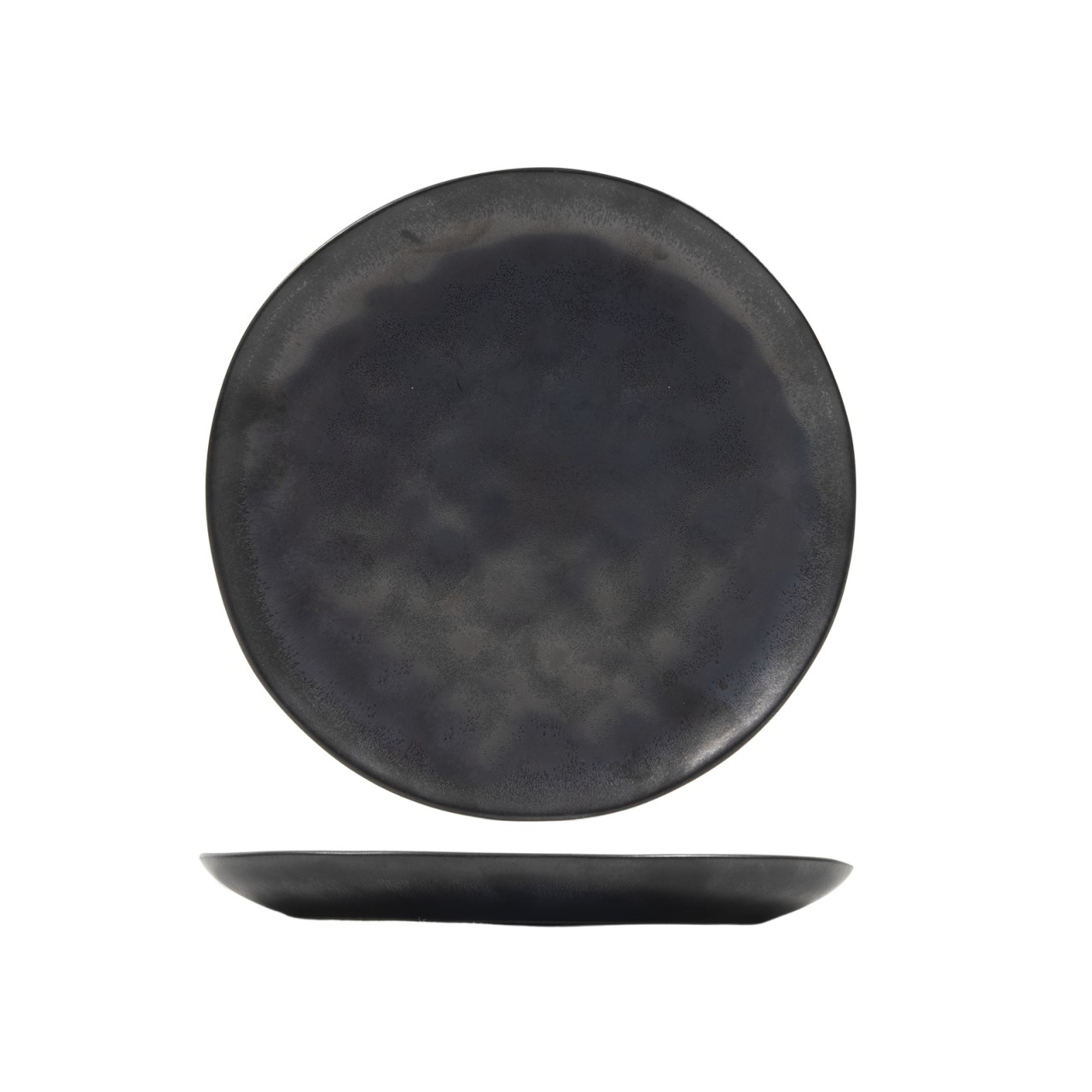 Ein flacher Teller mit einem Durchmesser von 20,5 cm und einem unregelmäßigen Rand in eleganter schwarzer Farbe. Aus feiner Keramik.