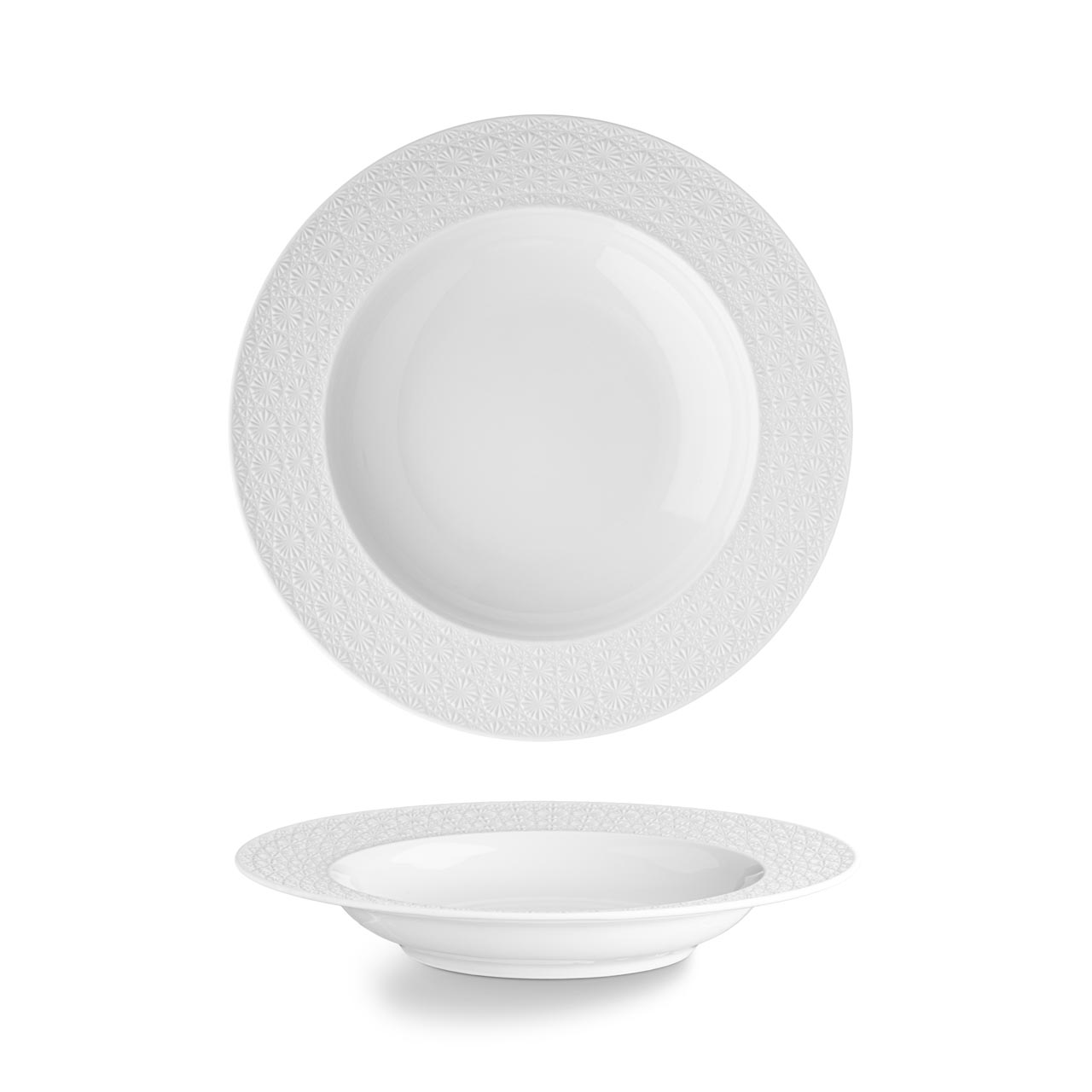 Tiefer Teller mit 23 cm Durchmesser. Eleganter Teller aus der Kollektion STARS mit unglasiertem Rand und einer Oberfläche in Natursteinoptik. Mikrowellen- und spülmaschinengeeignet.