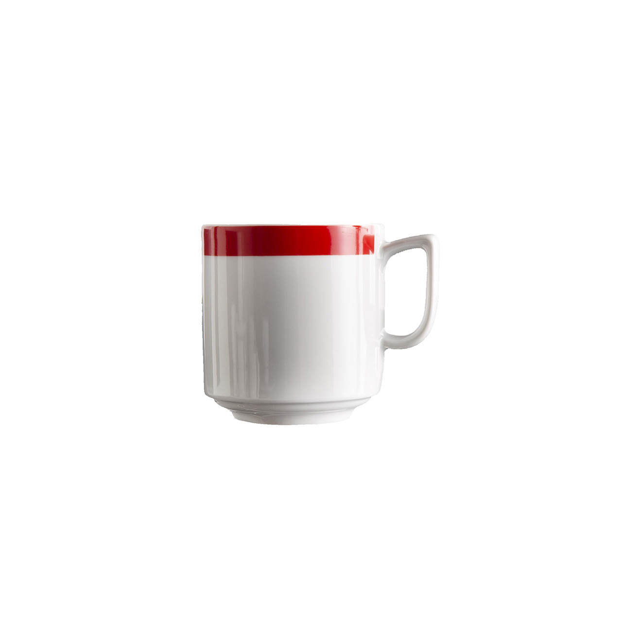 Becher/Tasse mit einem Volumen von 0,3 l, Henkel und rotem Rand.