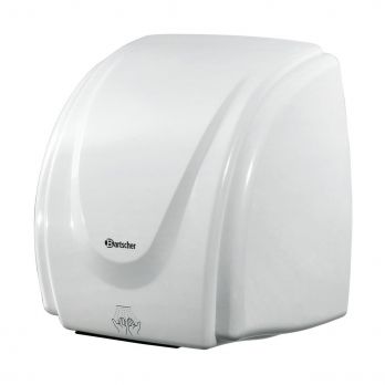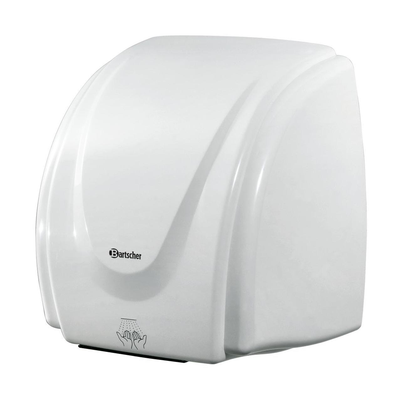 Händetrockner zur Wandmontage. Robustes Kunststoffgehäuse, weiß. Automatisches Ein-/Ausschalten über Infrarotsensor. Luftleistung: ca. 53 Liter pro Sekunde.